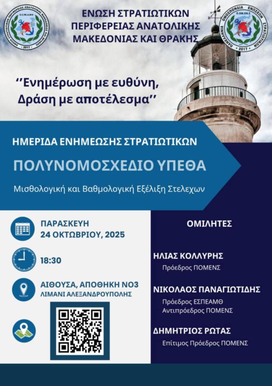 Η Ένωση Στρατιωτικών Περιφέρειας Ανατολικής Μακεδονίας και Θράκης (ΕΣΠΕΑΜ/Θ), από κοινού με την Πανελλήνια Ομοσπονδία Ενώσεων Στρατιωτικών (ΠΟΜΕΝΣ), σας προσκαλούν στην Ημερίδα Ενημέρωσης και Διαλόγου που θα πραγματοποιηθεί την Παρασκευή 24 Οκτωβρίου 2025 και ώρα 18:30 στην ΑΛΕΞΑΝΔΡΟΥΠΟΛΗ (”ΑΠΟΘΗΚΗ Νο3” – Λιμάνι Αλεξανδρούπολης), συνεχίζοντας το οδοιπορικό ενημέρωσης των συναδέλφων μας σε όλη την Περιφέρεια Ανατολικής Μακεδονίας και Θράκης.