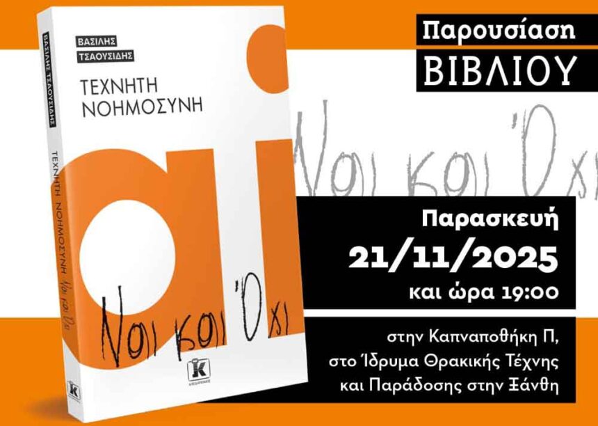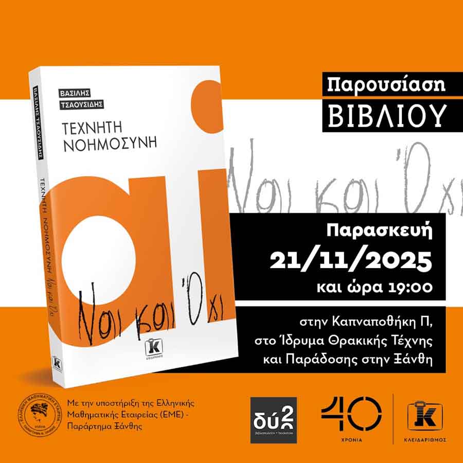 Οι Εκδόσεις Κλειδάριθμος και το βιβλιοπωλείο ΔΥΟ προσκαλούν στην παρουσίαση του βιβλίου του Καθηγητή του ΔΠΘ Βασίλη Τσαουσίδη με τίτλο “TEXNHTH ΝΟΗΜΟΣΥΝΗ – Ναι και Όχι”.